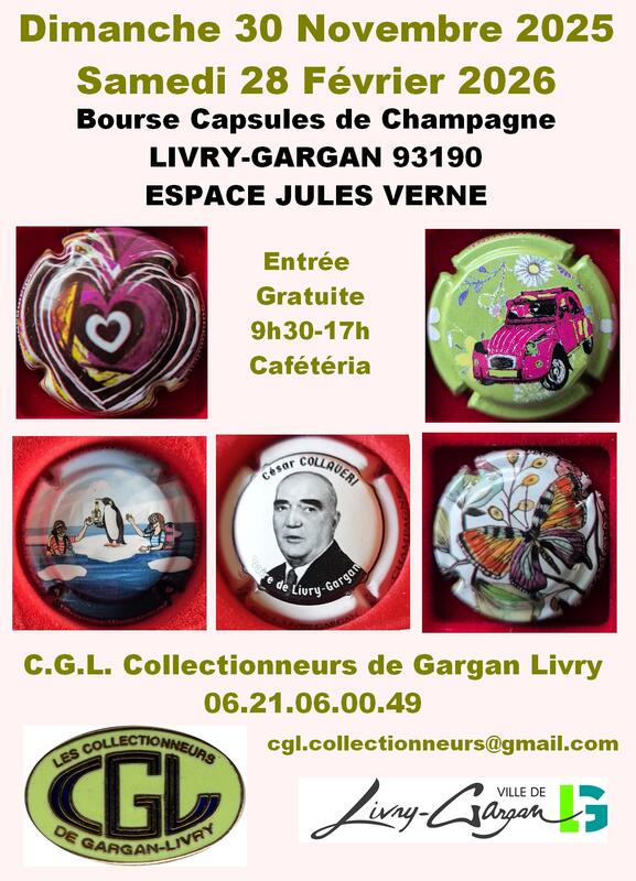 Les Collectionneurs de Gargan Livry (C.G.L.) préparent la 16ᵉ édition de leur bourse d’échange aux capsules de champagne, qui se tiendra à Livry-Gargan en 2026.